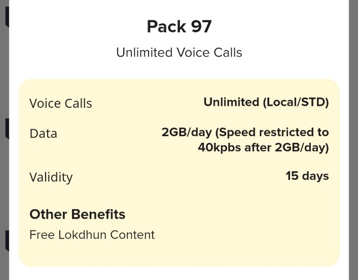 बीएसएनएल के 97 रुपए का रिचार्ज प्लान में अनलिमिटेड लोकल एचडी बात करने के लिए और साथ में 2GB डाटा प्रतिदिन मिलता है और इसकी वैलिडिटी पूरे 15 दिन के लिए होती है जो कि अब तक का सबसे सस्ता प्लान इंटरनेट और कॉल के लिए माना जाता है