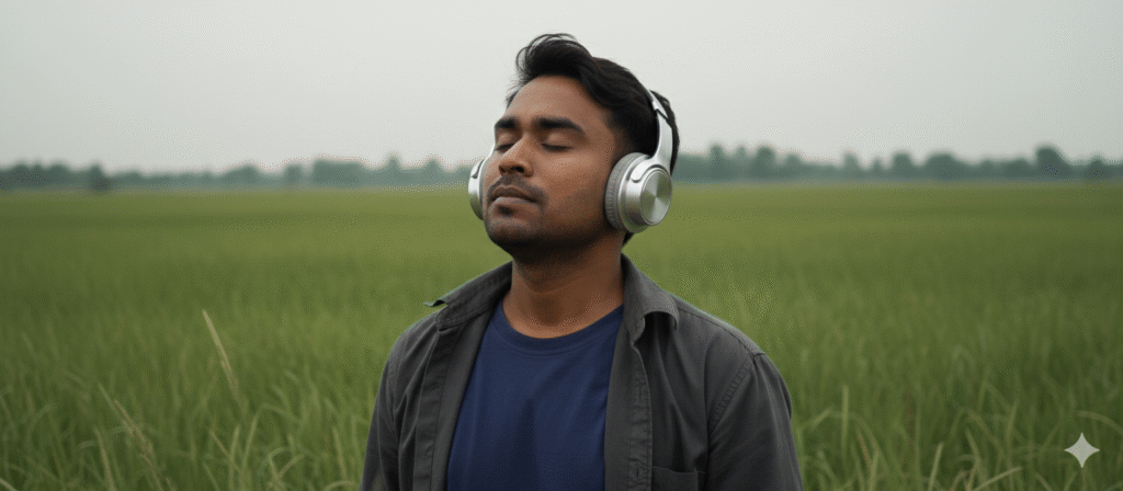Prompt 2: Use this person as the Base, preserving likeness, face, hair, and skin tone. Create a medium-close cinematic portrait outdoors in a lush green field, framed from waist up. Subject is facing slightly sideways, head tilted upward with eyes closed, wearing large over-ear silver headphones. Outfit is a loose dark button-up shirt over a plain deep-colored t-shirt. Lighting is soft, natural daylight under an overcast sky, emphasizing muted greens and grays for a